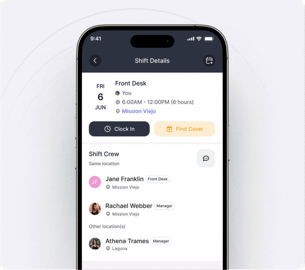 See who else is on your shift (front desk, managers, instructors) and who’s working nearby. Teamwork and communication become effortless.